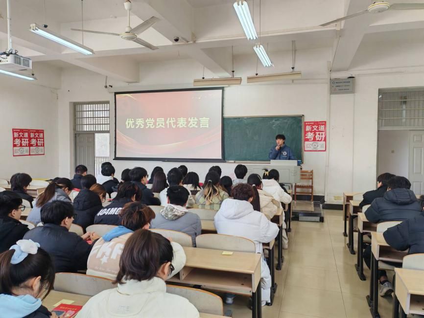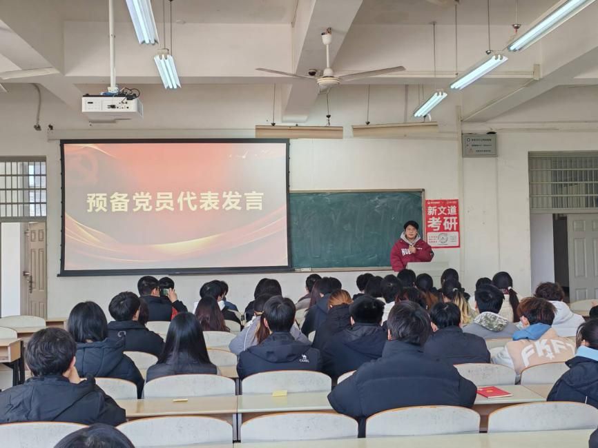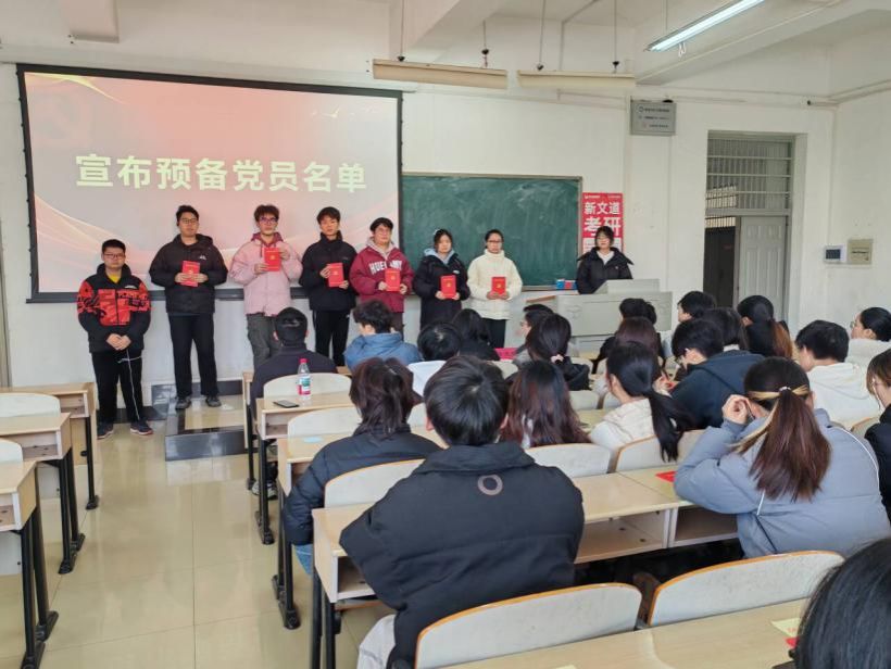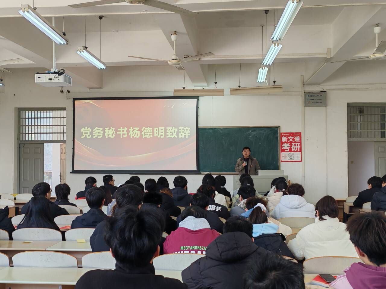 学院党务秘书杨德明同志代表党组织向新预备党员致以热烈祝贺。他谈到,从递交入党申请书到成为预备党员,是大家思想不断成熟、信念愈发坚定的过程,这份成长值得肯定。作为党务工作者,他向新党员提出三点希望:一是要永葆初心,始终牢记入党时的赤诚之心,把对党的忠诚融入日常学习生活,不辜负党组织的培养;二是要勤学善思,既要扎实学好专业知识,也要主动学习党的历史和理论,以理论武装头脑,指导实践;三是要勇于担当,主动承担班级、学院的工作任务,在志愿服务、学科竞赛等活动中冲在前、干在先,以实际行动彰显党员的先锋模范作用。最后,他鼓励全体新党员,要以党员身份为荣耀,以责任使命为动力,在青春的赛道上奋力奔跑,为学院发展和党的事业贡献自己的一份力量。