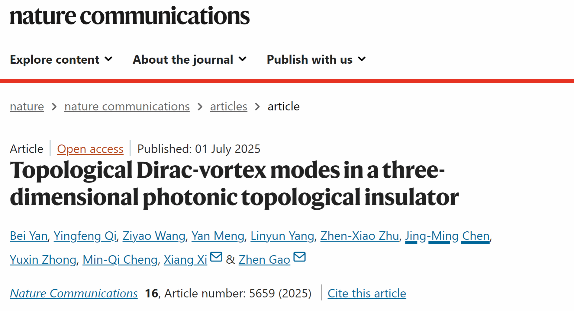 近日,我校英国365集团公司应用物理系青年教师颜贝与南方科技大学等单位合作首次在三维光学拓扑绝缘体中观测到一维拓扑狄拉克涡旋传输态,相关成果以“Topological Dirac-vortex modes in a three dimensional photonic topological insulator”为题发表在《Nature Communications》上。我校英国365集团公司应用物理系青年教师颜贝为该论文的第一作者,365英国官网为论文第二完成单位。